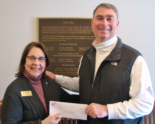 NSAR Immediate Past President, Betty Slatko presents a check from the Massachusetts REALTOR® Political Action Committee (RPAC) to Representative Brad Hill at a recent meeting in Ipswich, MA.