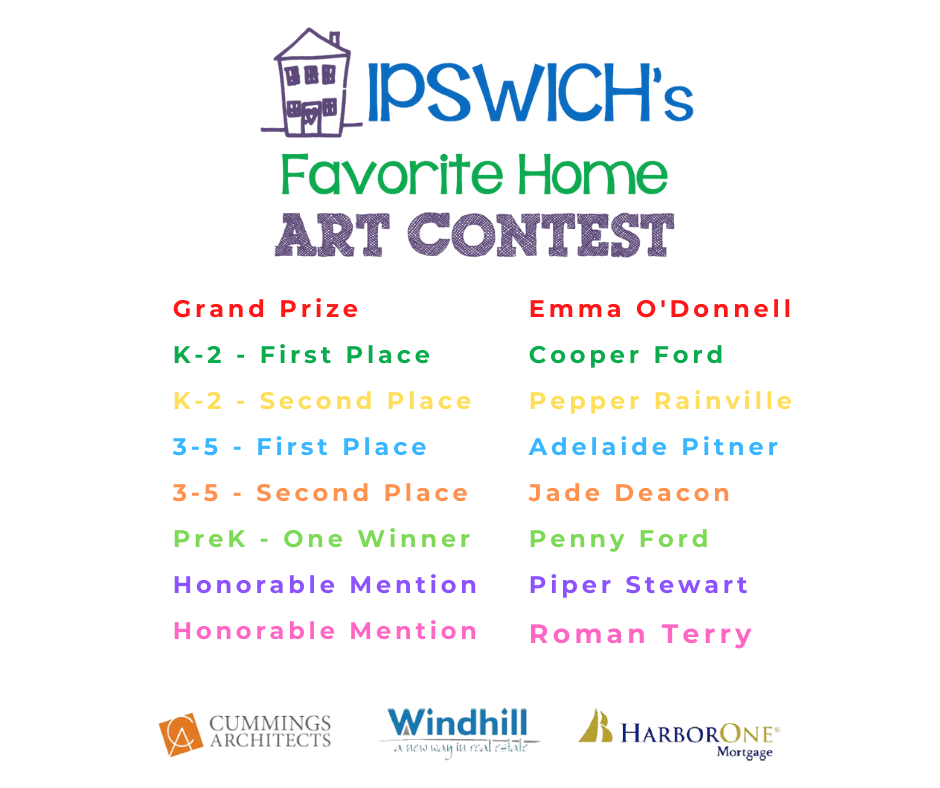 Ipswich's Favorite Home Art Contest 2022 was a blast! Thank you to all our very talented participants, our very official judge Ms. Morris from Ipswich High, and to our very generous co-sponsors, Cummings Architecture and Harbor One Financial! We awarded $600 in cash prizes along with art supplies, beach bags, thermoses, blankets, notepads, etc. We can't wait for next year!